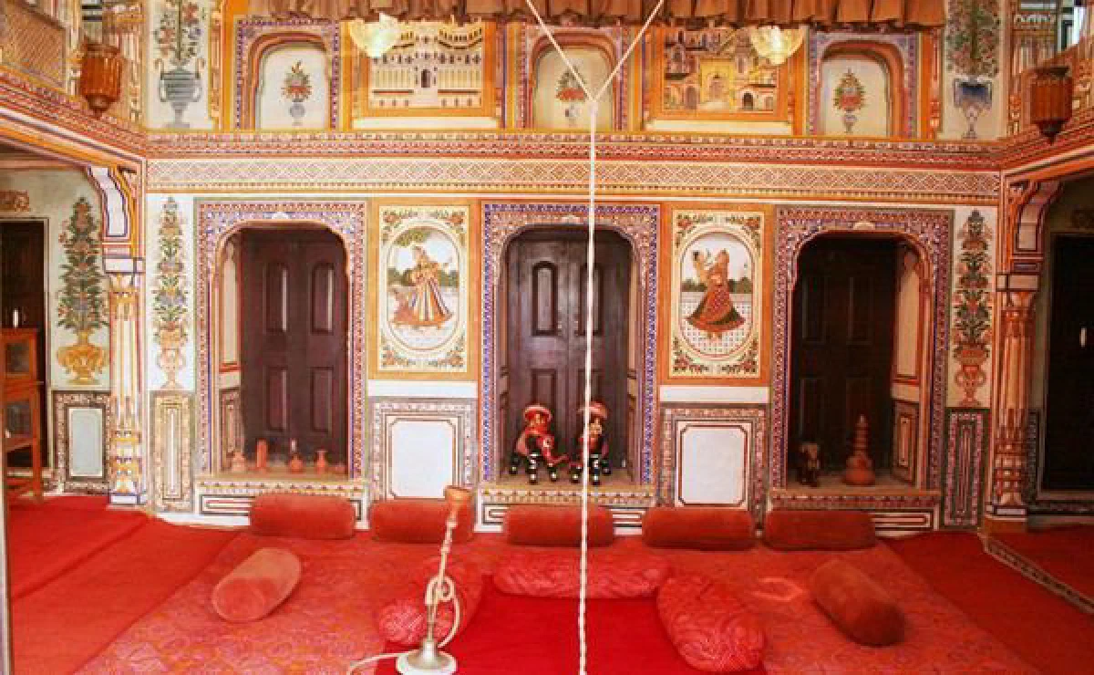 Nawalgarh is situated in the heart of Rajasthan's Shekhavati area, famous for its painted havelis and exquisite frescoes. Despite being one of the driest regions of a dry state of Rajasthan, the area of Shekhawati flourished primarily because of its location on the famous Silk Route. Canny Marwari traders of Shekhawati indulged in regular trade and prospered by giving sustenance to the caravans. These traders went on build lavish havelis (mansions) with their wealth and decorated them with colourful frescoes.The town of Nawalgarh has a great number of such painted havelis. The most important are the Aath Haveli (Eight Havelis) complex which their quaint European influenced frescoes. The Poddar haveli is lavishly painted and is now used as a primary school. In the Nawalgarh Quila (fort), watch for the Sheesh Mahal, where on the ceilings, you will find maps of Nawalgarh town and Jaipur, worked in inlaid mirror.