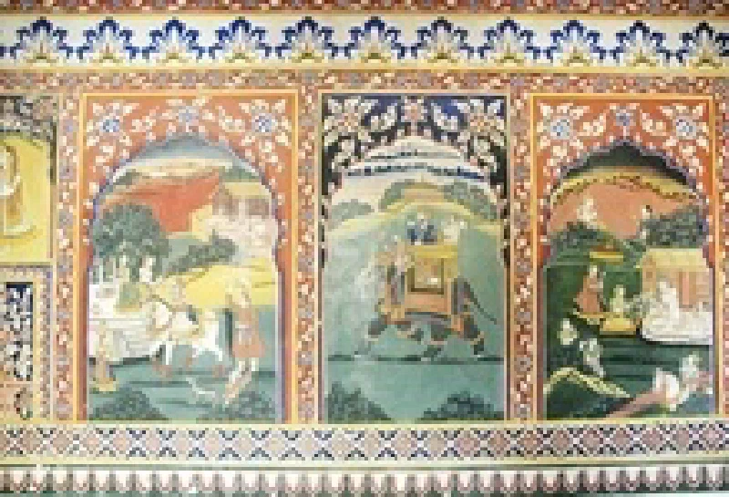 The Samode Palace has several frescoes - original and also newly redone, in many of its public areas. The Durbar Hall here is of special note, with its wall to ceiling frescoes and mirror work.